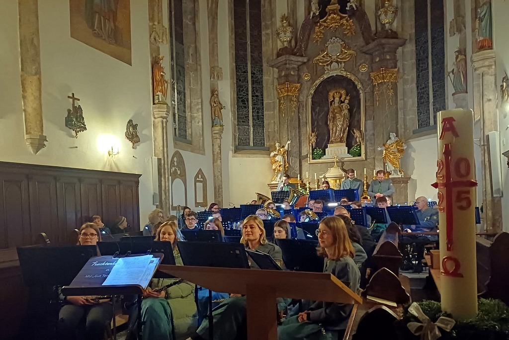 Alle zwei Jahre lädt die Trachtenkapelle zum Konzert in die Pfarrkirche Ramsau ein, um bei traumhafter Akustik die Besucherinnen und Besucher zu begeistern. Dieses Jahr fand das Event erstmals mit Kapellmeister Sebastian Stritzl statt. Dass es sich beim Kirchenkonzert um ein besonderes musikalisches Ereignis handelt, wurde bereits bei der Eröffnung mit dem Stück „The Story“ deutlich. Nach dem gelungenen Auftakt begrüßte Obmann Markus Mitterböck zu dem Konzert und auch Pfarrer Slavomír Dlugoš hieß die Menschenwillkommen. Neben verschiedenen Ehrengästen freute sich die Gemeinde besonders über den Besuch des Generalvikars Dr. Christoph Weiss. Anschließend übernahm Martina Reichel, die Moderatorin des Abends, das Wort und führte die Zuhörenden durch das Programm. Von romantischen Balladen, über diverse Solostücke, hin zu Videospielmusik wurden die verschiedensten musikalischen Welten eröffnet. Nach den ersten Stücken schaffte es das Brassensemble unter der Leitung von Dr. Franz Vonwald, die Zuhörerinnen und Zuhörer mit prachtvoller Barockmusik in das 17. Jahrhundert zu versetzen. Besonders das Stück „Näher mein Gott zu dir“ zeigte, dass Kirche und Musik stark verbunden sind. Verschiedenste Anlässe– feierliche, glückliche, aber auch traurige Momente – wären ohne die begleitende Musik unvorstellbar. Der Musik und dem Glaube gelingt es, Gedanken festzuhalten, wenn Worte nicht reichen. Sie erreichen die Herzen der Menschen und schaffen eine innige Verbindung. Dies bestätigte sich auch in der Pfarrkirche Ramsau, als die Trachtenkapelle das Konzert unter tosendem Applaus beendete.