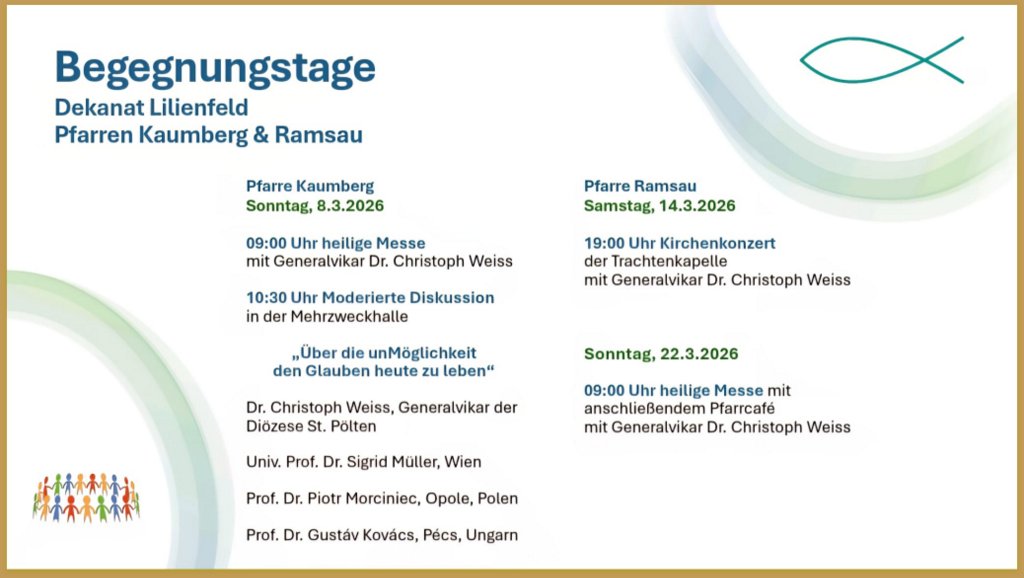 Alle Interessierten sind herzlich eingeladen, an den Gottesdiensten mit Generalvikar Dr. Christoph Weiß am Sonntag, 8.3.2026, in Kaumberg und am Sonntag, 22.3.2026, in Ramsau, jeweils um 9.00 Uhr, und an den anschließenden Programmen teilzunehmen!