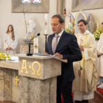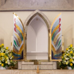 Nach dem Segen erzählte Pfarrer Slavomír von der Gestaltung des Tabernakels: „Wir haben Stein und Glas ausgewählt – Materialien, die in unserer Kirche vorhanden sind und den Altarraum harmonisch vollenden. Die betenden Hände beim geschlossenen Tabernakel, soweit es das Glas erlaubte, darzustellen, stehen symbolisch für uns mit unseren Leben, Plagen und Freuden, hellen und dunklen Farben, die trotz allem eine Harmonie ergeben. Das Leben ist schön! Der vergoldete Rahmen sowie die gläsernen Elemente, die beim offenen Tabernakel wie Engelsflügel wirken, stehen für das Göttliche, das uns berührt. Das Gesamte vermittelt den Eindruck eines Mysteriums, insbesondere wenn man bedenkt, dass das Glas das Allerheiligste beherbergt – ein Geheimnis, Geheimnis des Glaubens.“