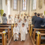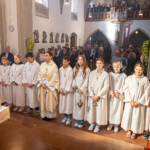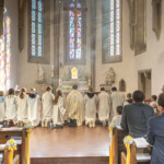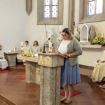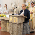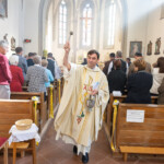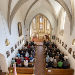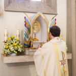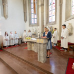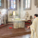 Nach der Kommunionspendung erhob sich die Kirchengemeinde und stimmte das Lied „Deinem Heiland, deinem Lehrer“ an. Nun zog der Priester, begleitet von den Ministranten, von der Marienkapelle zum Altar und stellte die Monstranz in den Tabernakel. Mit einem Gebet und durch die Übertragung des Allerheiligsten in den neuen Tabernakel wurde dieser auf schlichte, aber eindrucksvolle Weise geweiht. Der Priester, die Ministranten und die ganze Gemeinde knieten nieder zu einer kurzen Anbetung. In die Stille hinein ertönte „Locus iste“ von Anton Bruckner, behutsam intoniert vom Kirchenchor. Anschließend folgte der eucharistische Segen.