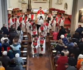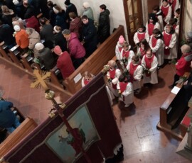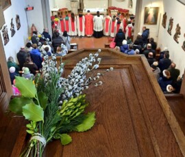 Pfarrer Slavomír Dlugoš zog aus der Sakristei mit seiner Ministrantenschar vor den Marienaltar. Nach dem Evangelium vom Einzug Jesu in Jerusalem segnete der Priester die Palmbuschen und -zweige, wonach er mit Pfarrassistent Thomas und den Minis zum Altarraum schritt.