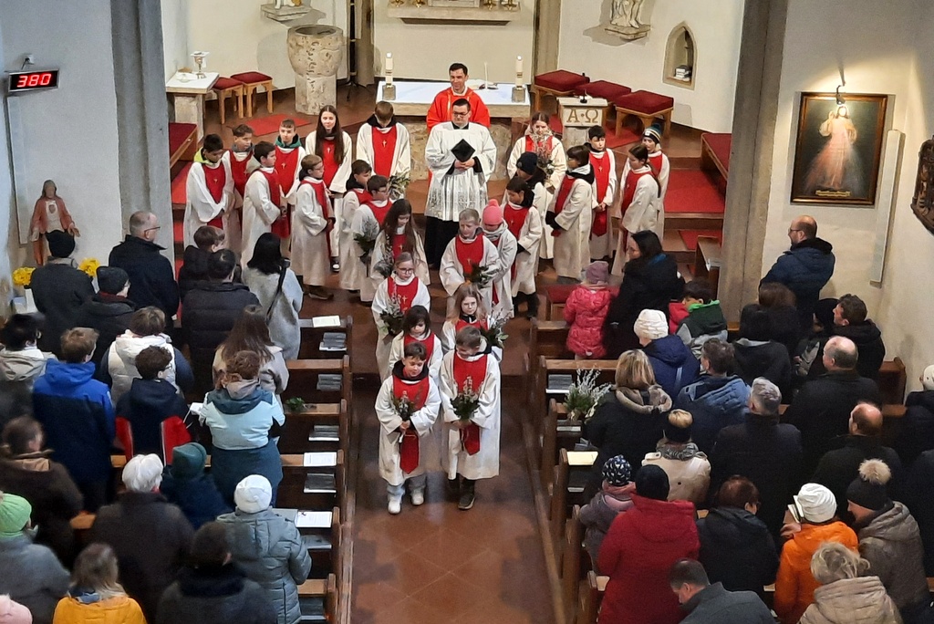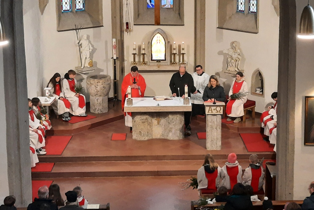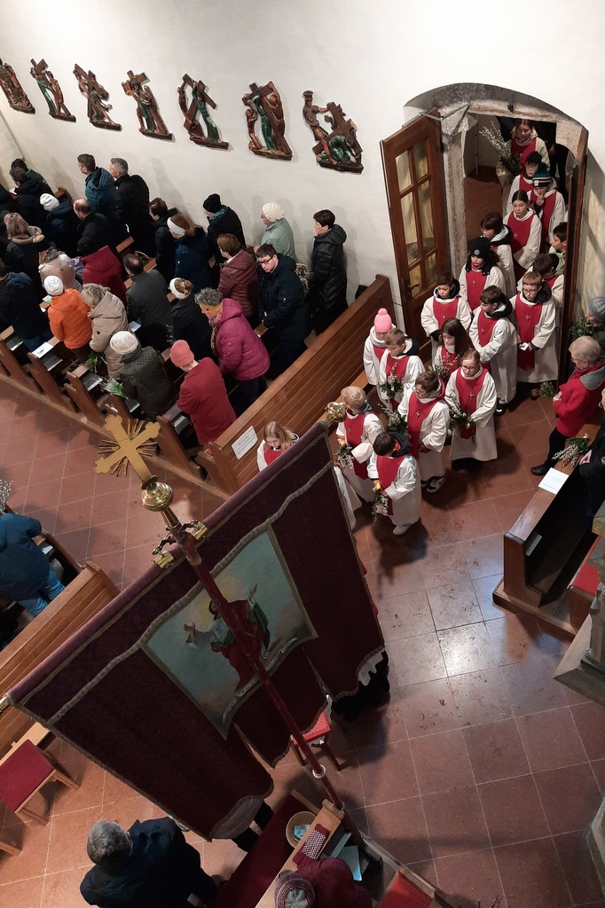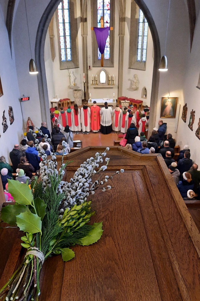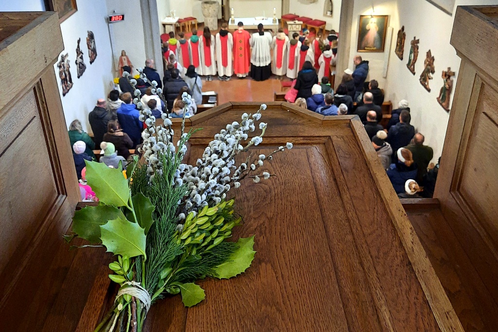 Pfarrer Slavomír Dlugoš zog aus der Sakristei mit seiner Ministrantenschar vor den Marienaltar. Nach dem Evangelium vom Einzug Jesu in Jerusalem segnete der Priester die Palmbuschen und -zweige, wonach er mit Pfarrassistent Thomas und den Minis zum Altarraum schritt.