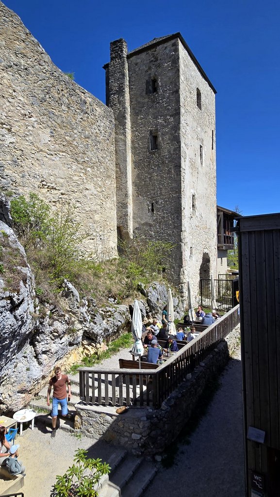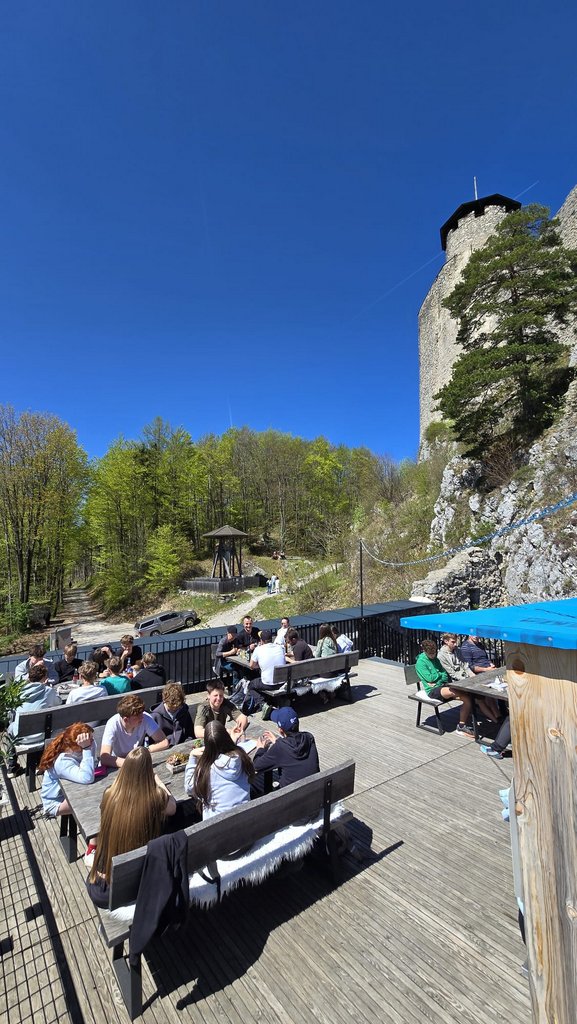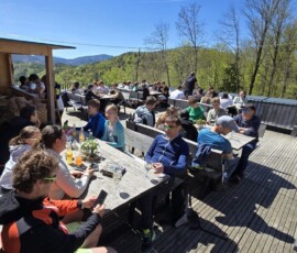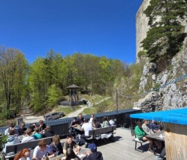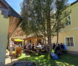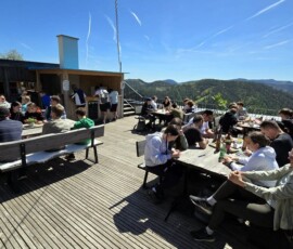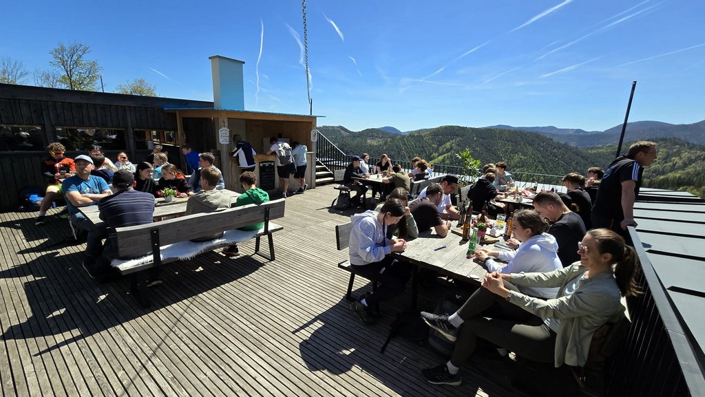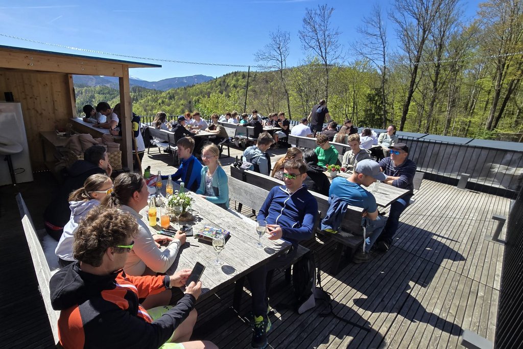 Auf der Aussichtsterrasse des Araburgstüberls stärkten wir uns mit Spaghetti und Gulaschsuppe. Ein herzlicher Dank an die Einladung der Pfarre Kaumberg für diese großzügige Jause!