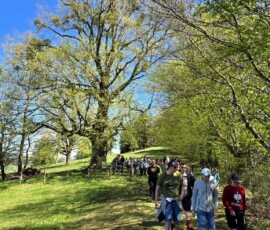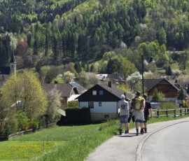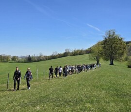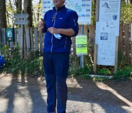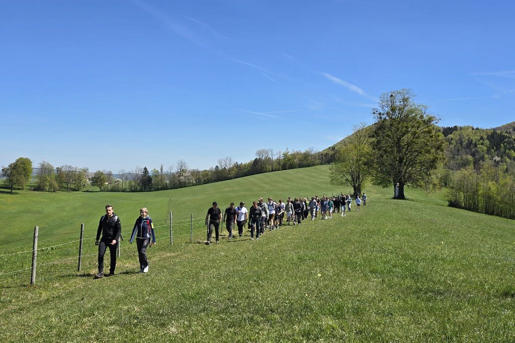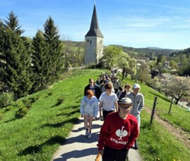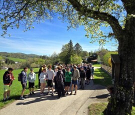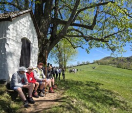 Bei herrlichem Wetter starteten wir am Kirchenvorplatz unseren Weg. Hier befand sich die erste von zwölf Stationen, wo spirituelle Texte und Pilger-Impulse vorgetragen wurden.
