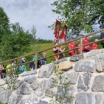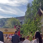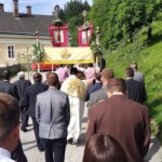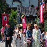 Selten schön spannt sich nach einigen verregneten Tagen heute der Himmel über der Ortschaft, selten schön auch der Blumenschmuck überall. Die vier Tragestangen des Baldachins sind mit üppigen Blumenkränzen geschmückt, unter diesem „Himmel“ trägt der Priester ehrfürchtig die Monstranz, umwunden von einem feinen weißen Blütenschleier. Kränze in allen Farben zieren die festlichen Fahnen. Bei den Altären Gesang, Evangelium, eindringliche Fürbitten und Gebete, der Höhepunkt von Fanfaren begleitet – der Segen mit dem Allerheiligsten für den Ort und seine Bewohner, die Früchte der Erde und die Arbeit der Menschen.
