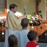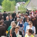 Beim letzten Altar wendet sich Pfarrer Slavomir Dlugoš besonders an die Abordnungen der Vereine, aber auch an alle anderen Mitfeiernden. Er lädt herzlich ein, auch die anschließende Messfeier – den eigentlichen Höhepunkt des Festes – zu besuchen und tatsächlich füllt sich die Kirche beim Eintreffen der Prozession rasch, kaum ein Sitzplatz im Kirchenschiff bleibt frei.